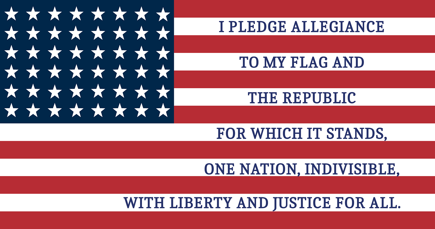 Next, we see the flag of the United States with 48 stars and the Pledge of Allegiance from 1892 (first version).